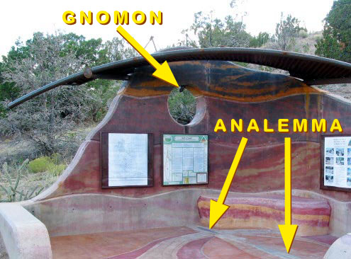 Our noon analemma sundial is a solar calendar. Each day the sun's path across the sky is a little higher or lower, depending on the season, than it was the day before. The rays of the sun passing through that south-facing circular window (and through the aperture in the pointer in that window, called a gnomon), casts a bright spot on the floor of the info-sculpture. In the days leading to the summer solstice the spot moves closer and closer to the south wall (each day the sun is rising higher in the sky), and as we move into winter it works its way up toward the north banco (lower in the sky each day). The "lopsided 8" design in the floor of the info-sculpture is called a NOON ANALEMMA because it is derived from the path of the noontime solar spot throughout the year. See it for yourself!